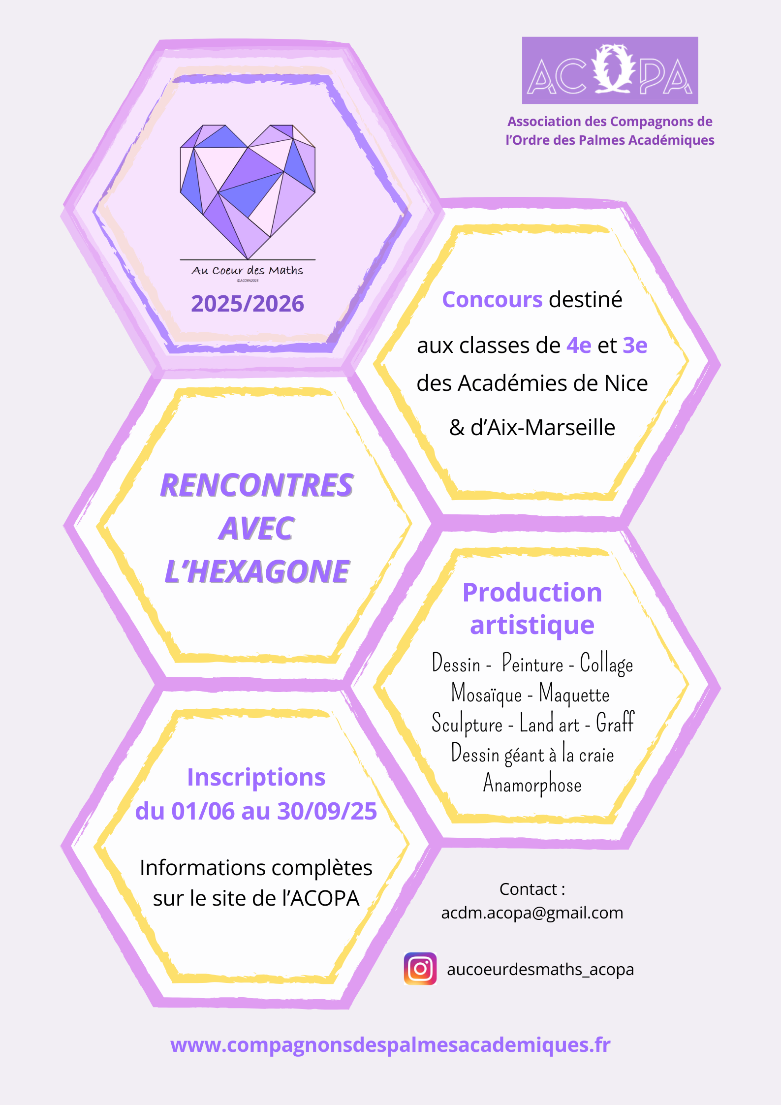 « Au cœur des Maths » est une action mise en place par l’ACOPA depuis la rentrée 2025, dans le but de contribuer à une dynamique autour des Mathématiques. dans les établissements scolaires des Académies de Nice et d’Aix-Marseille.