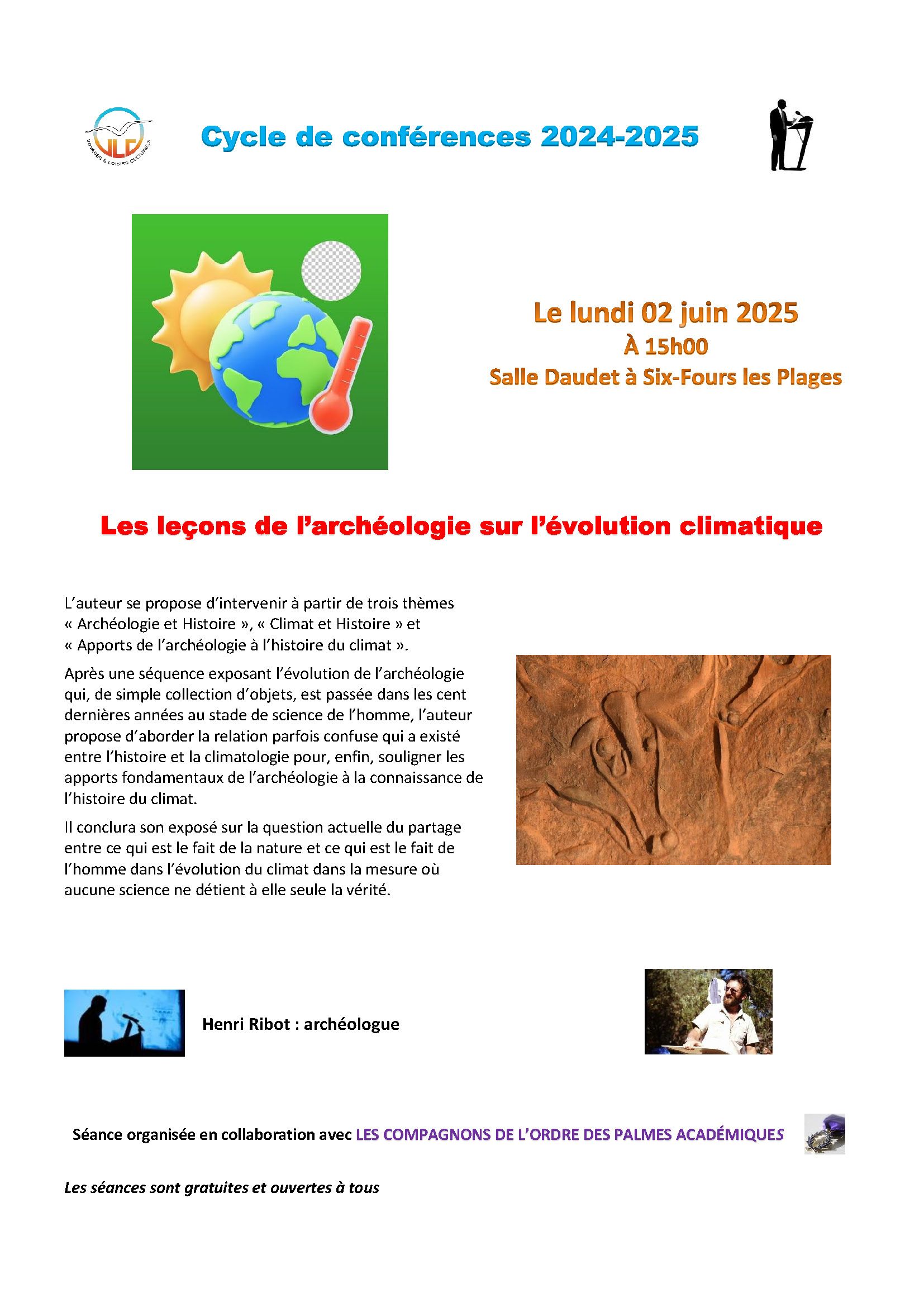 La conférence du 2 juin 2025 de M. Henri Ribot, archéologue, s'est tenue en partenariat avec VLC (Voyages, Loisirs, Cultures) à la salle Daudet de Six-Fours-les-Plages.