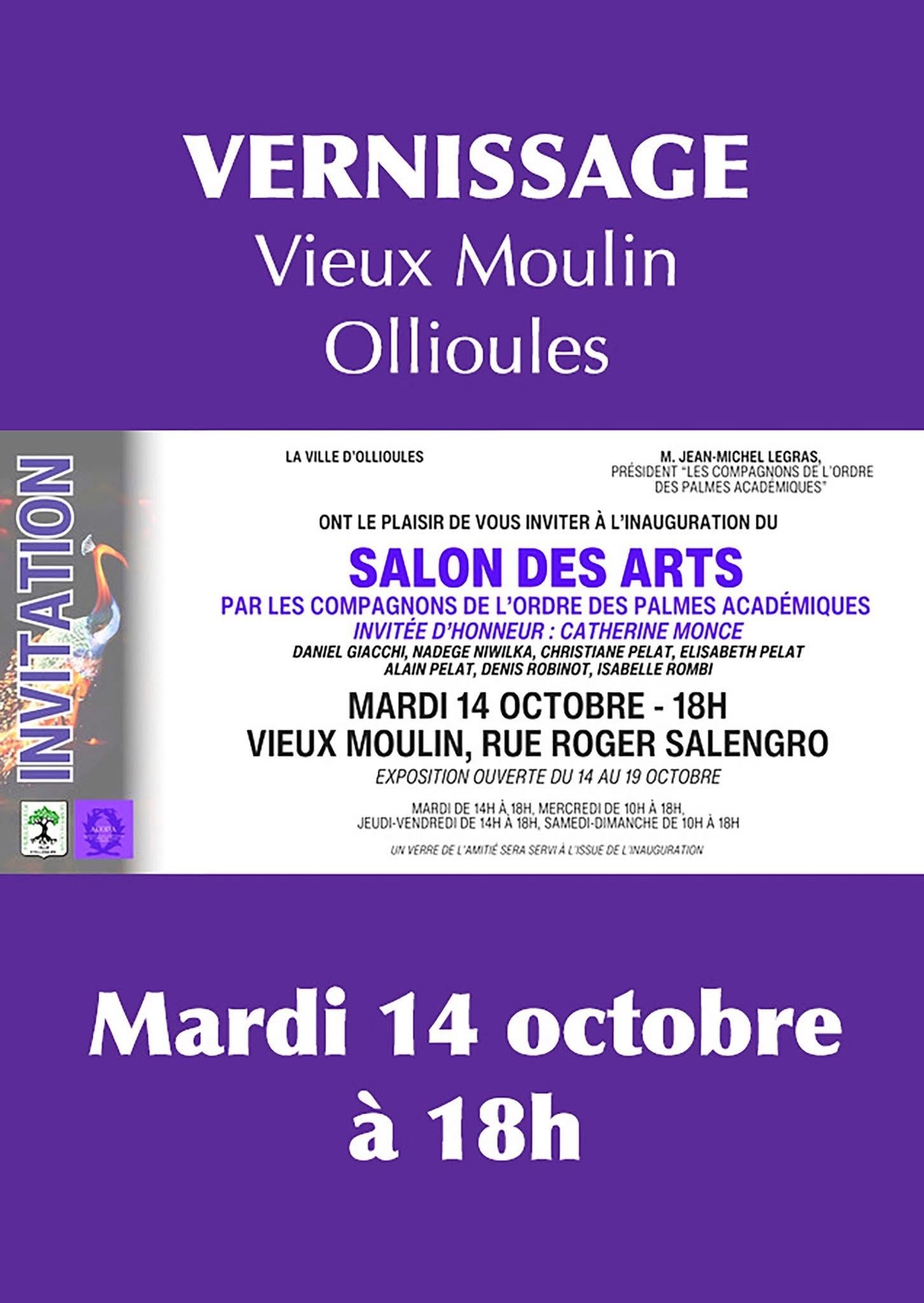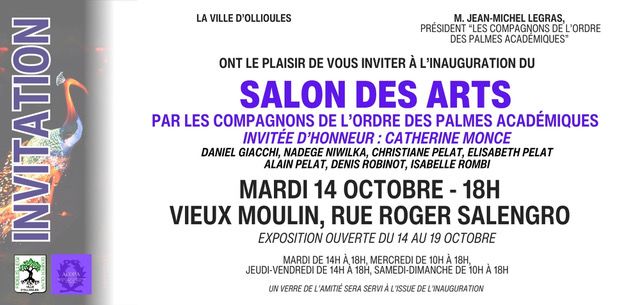 L'ACOPA a eu le plaisir de vous inviter au Salon des Arts 2025 présenté du lundi 14 octobre au dimanche 19 octobre 2025 au Moulin d’Ollioules et dont l'invité d'honneur était la photographe - plasticienne - écrivaine Catherine Monce.